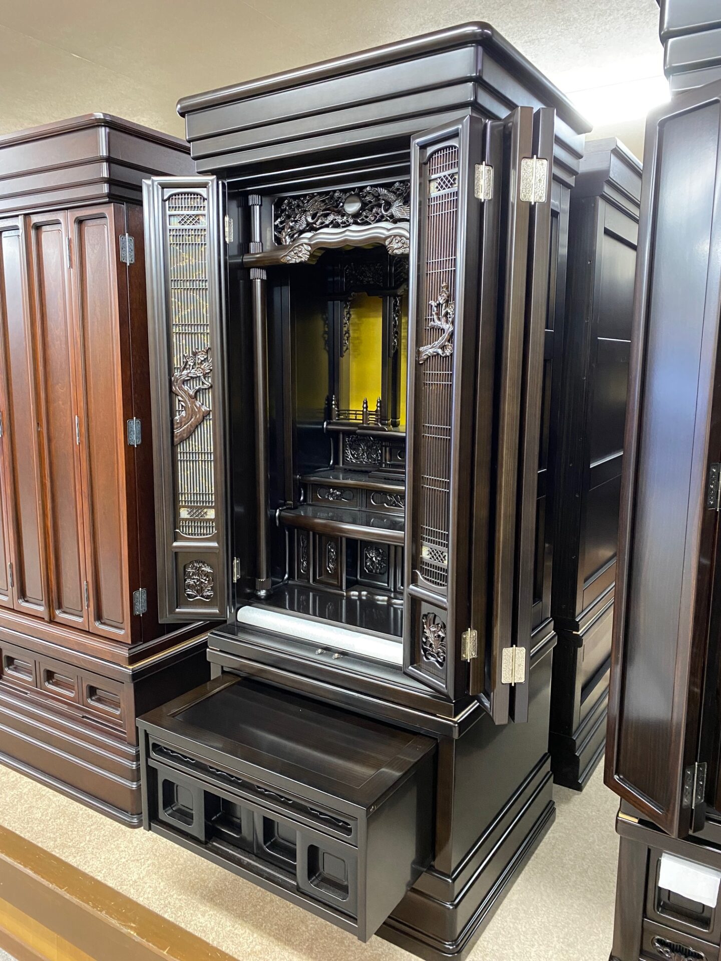 黒檀机式21号 黒檀机式21号 商品仕様素材黒檀サイズ高 1730mm 幅 710mm 奥行 600mm付属品仏像・位牌・経机等々仏具一式 *詳細に見本写真写真(鉄刀木仏壇に仏具一式付属例)商品詳細付属見本仏具例写真 仏像・位牌・経机等々仏具一式 *詳細に見本写真写真(鉄刀木仏壇に仏具一式付属例)#収納机引出し前のページへ戻る