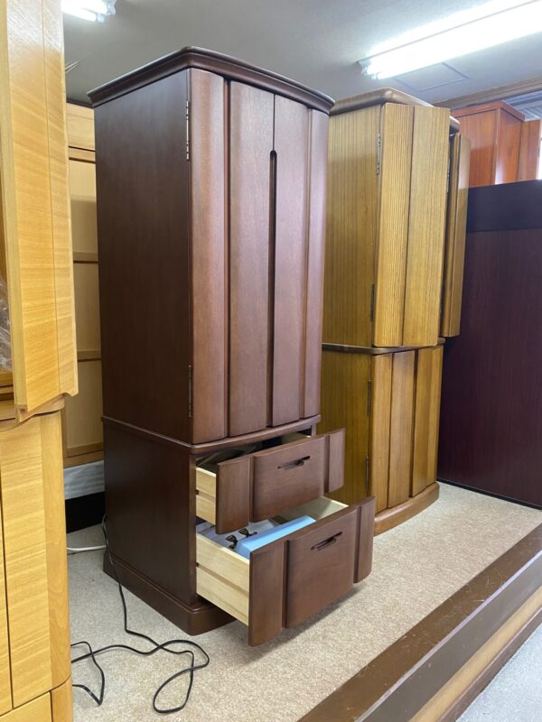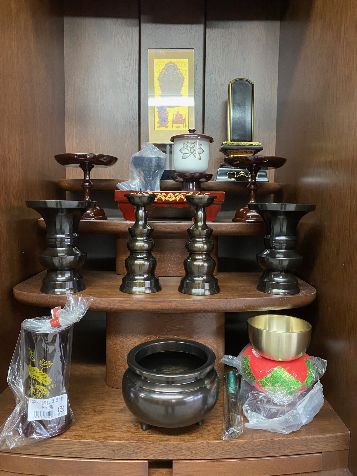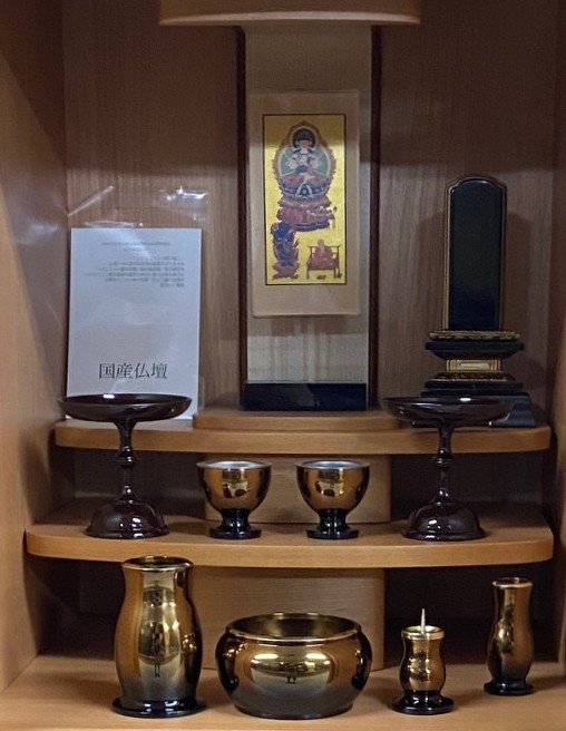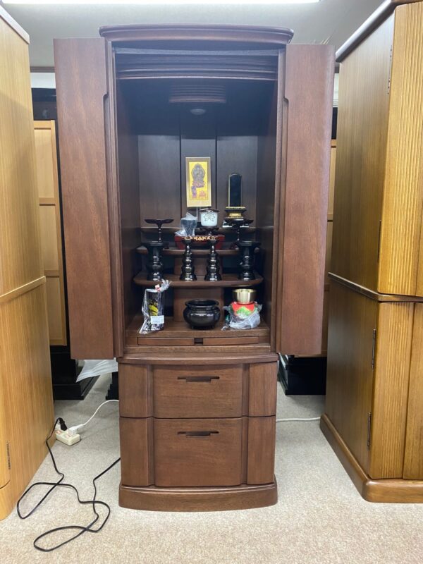 14号台付 大河 クルミ 14号台付 大河 クルミ 商品仕様素材クルミ(ウォールナット)サイズ高 1240mm 幅 470mm 奥行 430mm付属品位牌等仏具一式付(付属仏具見本例写真添付) 本尊・脇掛は三尊佛掛軸台前のページへ戻る